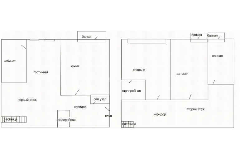 Планировка: 1- ый этажа: прихожая и гардеробная, ванная, кухня, гостинная, спальня, 2 - ой этаж - две комнаты, ванная комната, два балкона.
