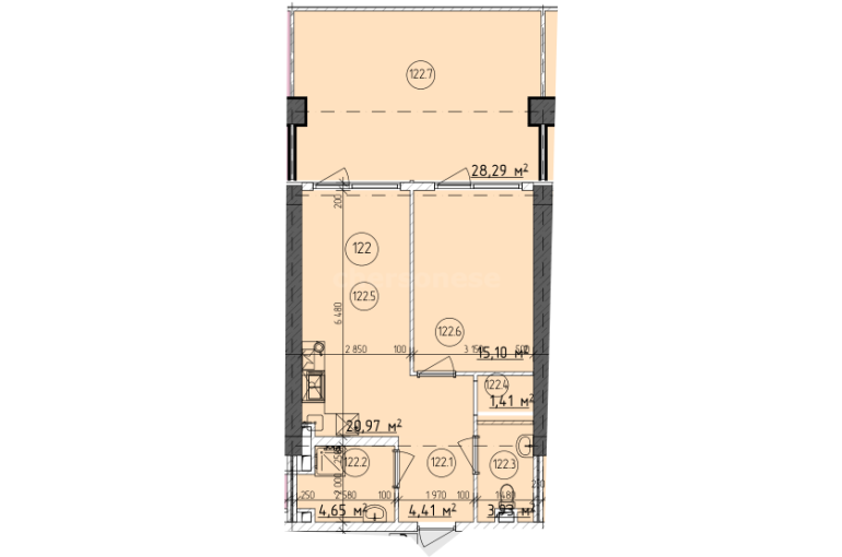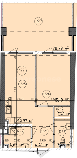 В продаже имеются апартаменты с полной отделкой, бытовой техникой, текстильным инвентарем и мебелью в жилом комплексе "Cosmos Stay" премиум-класса. Общая площадь составляет 78,76 кв.м., при этом кухня занимает 20,97 кв.м. Все окна выходят на одну сторону. В квартире есть лоджия и санузел. Высота потолков достигает 2.9 м.