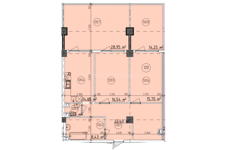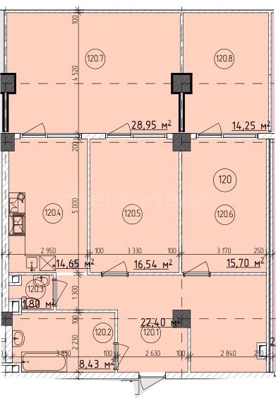 В продаже имеются апартаменты с полной отделкой, бытовой техникой, текстильным инвентарем и мебелью в жилом комплексе "Cosmos Stay" премиум-класса. Общая площадь составляет 122,23 кв.м., при этом кухня занимает 14,65 кв.м. Все окна выходят на одну сторону. В квартире есть лоджия и санузел. Высота потолков достигает 2.9 м.