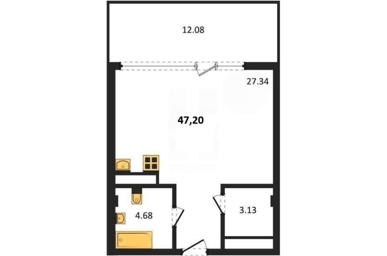 В продаже имеются студио-апартаменты с отделкой в жилом комплексе "Garden" премиум-класса. Общая площадь составляет 47,2 кв.м., при этом жилая зона с кухней занимает 27,34 кв.м. Все окна выходят на одну сторону. В квартире есть лоджия и санузел. Высота потолков достигает 2.7 м.